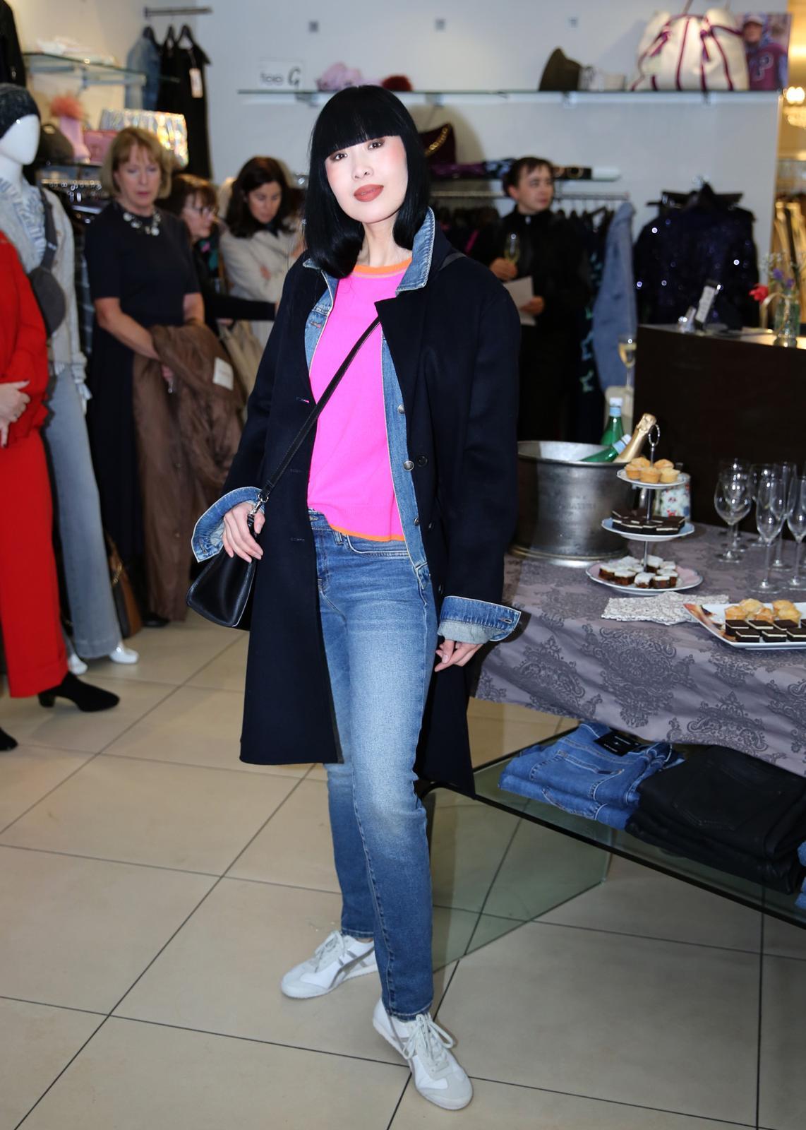 Yomiko Chen wearing Hartford Navy wool coat over Brodie cashmere pink & orange knit paired with Seven For All Mankind Roxanne Denims.