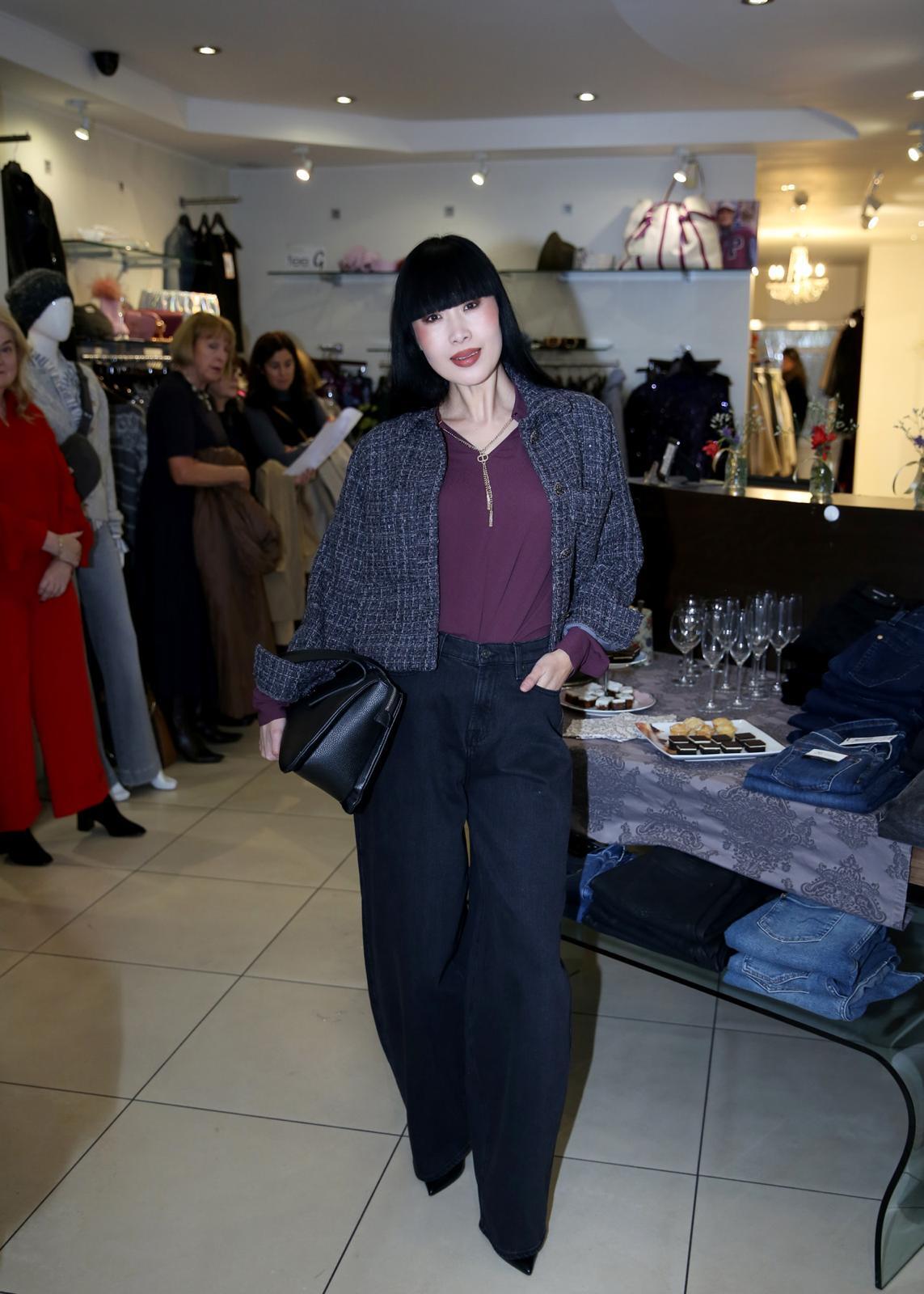Yomiko in an Esqualo grey tweed jacket over a Twinset burgundy blouse, styled with 7 For All Mankind black balloon denims.