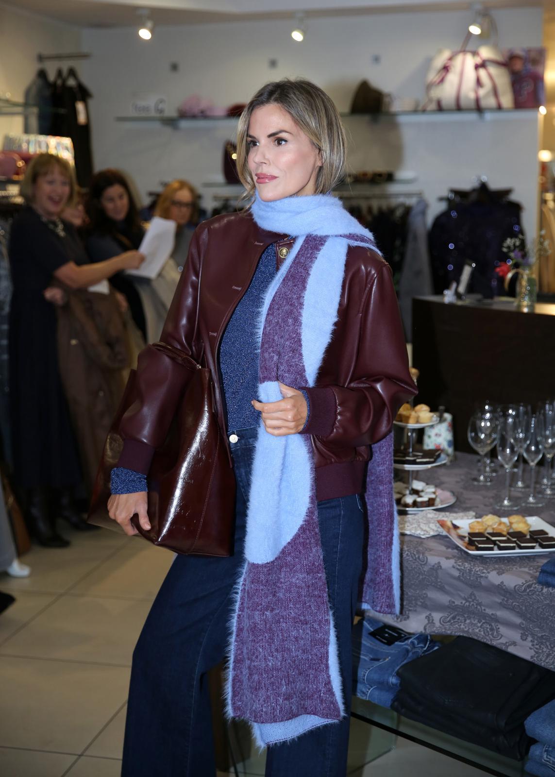 Rosalind in a burgundy coated jacket by Twinset, worn over a blue lurex top by Pom, paired with Seven Dojo dark denims and a burgundy-and-blue Pom scarf.